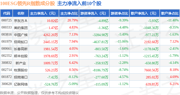 资金流向方面,100ESG领先R(470030)指数成份股当日主力资金净流出合计78.96亿元,游资资金净流入合计19.01亿元,散户资金净流入合计59.95亿元。成份股资金流向详情见下表: