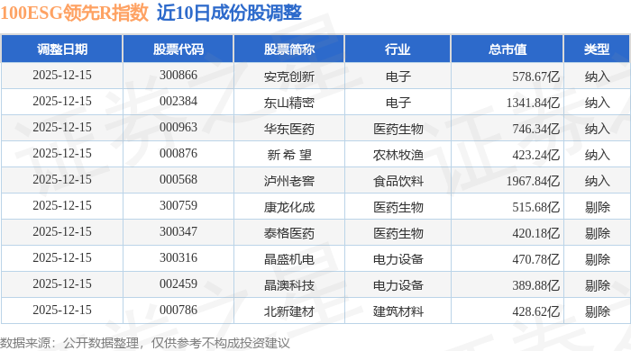 近10日内100ESG领先R(470030)指数成份股做了调整,新纳入了5只股票,剔除了5只股票。