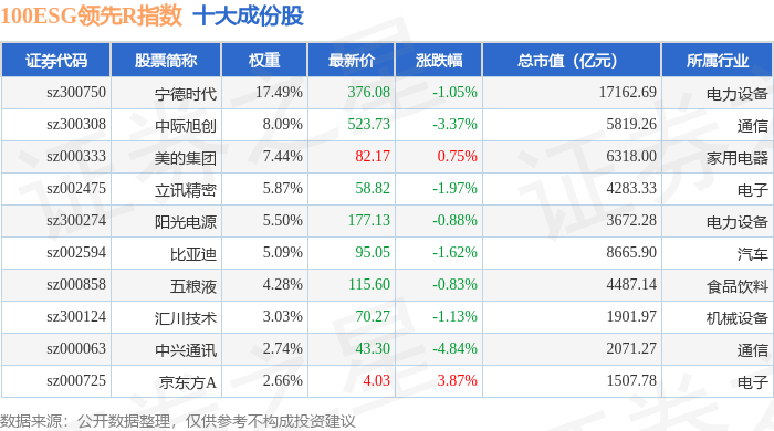 证券之星消息,12月3日,100ESG领先R(470030)指数报收于9048.44点,跌1.19%,成交1032.54亿元,换手率1.38%。当日该指数成份股中,上涨的有9家,京东方A以3.87%的涨幅领涨,下跌的有41家,中兴通讯以4.84%的跌幅领跌。