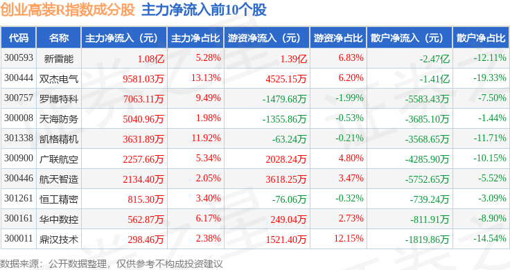 资金流向方面,创业高装R(470040)指数成份股当日主力资金净流出合计9.19亿元,游资资金净流入合计4.1亿元,散户资金净流入合计5.09亿元。成份股资金流向详情见下表: