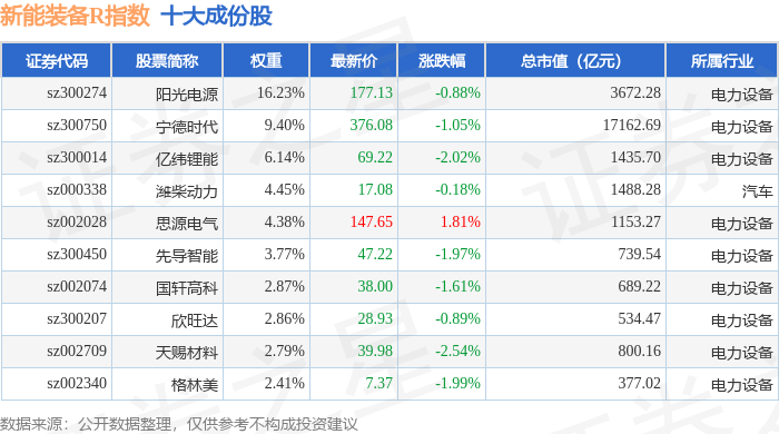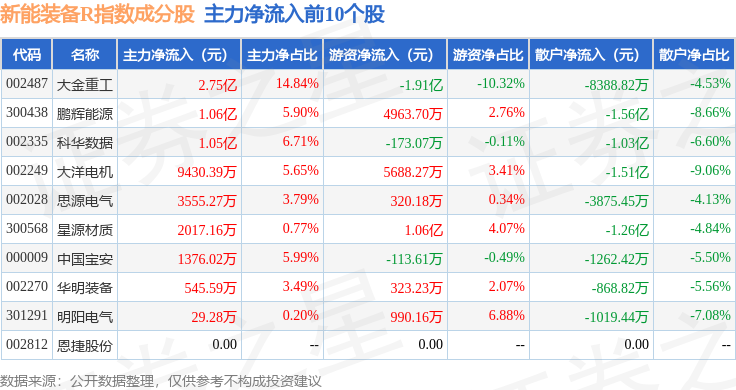 资金流向方面,新能装备R(470043)指数成份股当日主力资金净流出合计30.95亿元,游资资金净流入合计4.76亿元,散户资金净流入合计26.19亿元。成份股资金流向详情见下表: