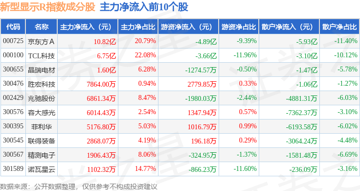 资金流向方面,新型显示R(470048)指数成份股当日主力资金净流出合计5.37亿元,游资资金净流出合计7.24亿元,散户资金净流入合计12.6亿元。成份股资金流向详情见下表: