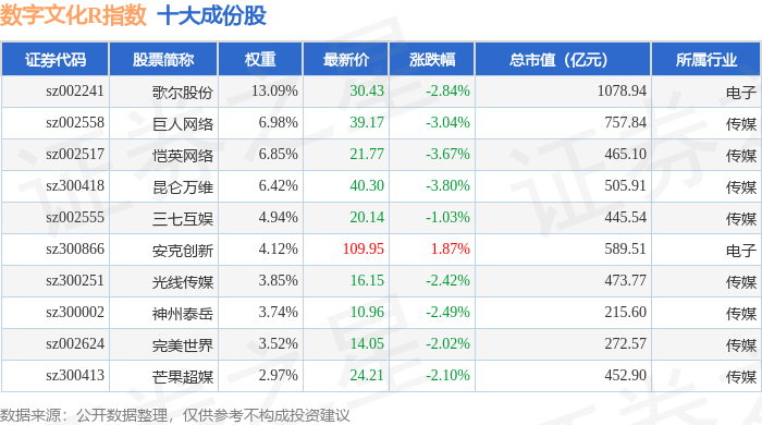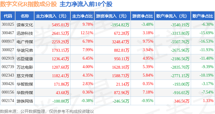 资金流向方面,数字文化R(470047)指数成份股当日主力资金净流出合计21.53亿元,游资资金净流入合计2.63亿元,散户资金净流入合计18.9亿元。成份股资金流向详情见下表: