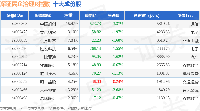 资金流向方面,深证民企治理R(470058)指数成份股当日主力资金净流出合计44.43亿元,游资资金净流入合计10.47亿元,散户资金净流入合计33.96亿元。成份股资金流向详情见下表: