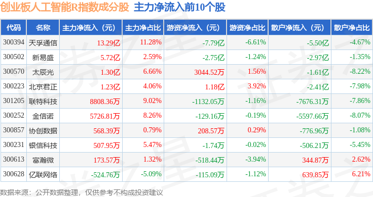 资金流向方面,创业板人工智能R(470070)指数成份股当日主力资金净流出合计33.19亿元,游资资金净流入合计11.57亿元,散户资金净流入合计21.61亿元。成份股资金流向详情见下表: