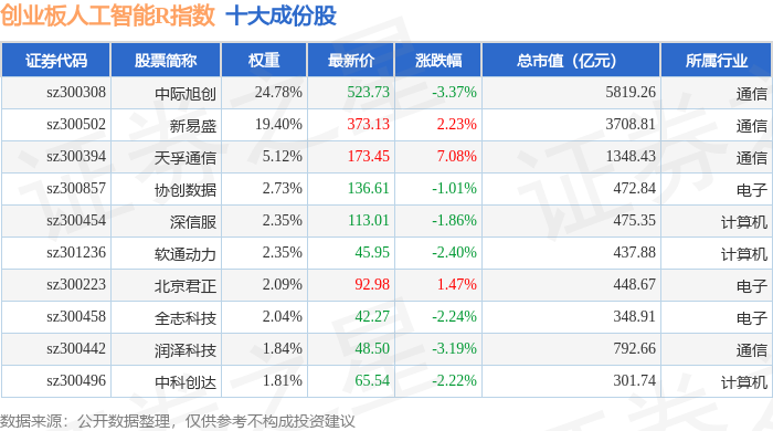 创业板人工智能R(470070)指数十大成份股详情如下: