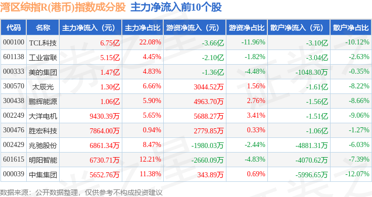 资金流向方面,湾区综指R(港币)(480004)指数成份股当日主力资金净流出合计90.36亿元,游资资金净流入合计15.09亿元,散户资金净流入合计75.41亿元。成份股资金流向详情见下表: