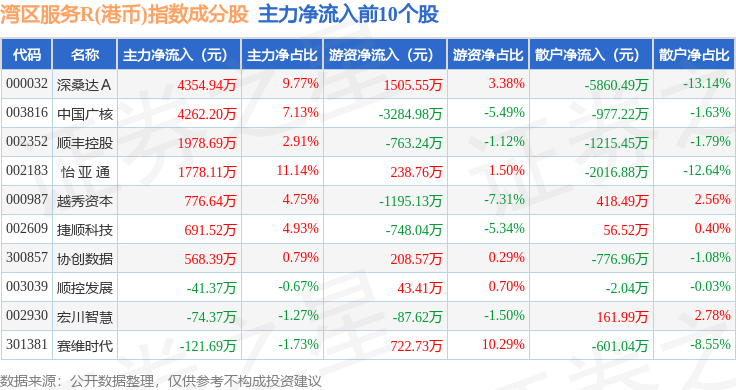 资金流向方面,湾区服务R(港币)(480012)指数成份股当日主力资金净流出合计16.1亿元,游资资金净流入合计2.9亿元,散户资金净流入合计13.2亿元。成份股资金流向详情见下表:
