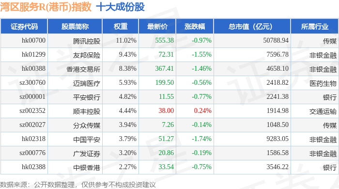 湾区服务R(港币)(480012)指数十大成份股详情如下: