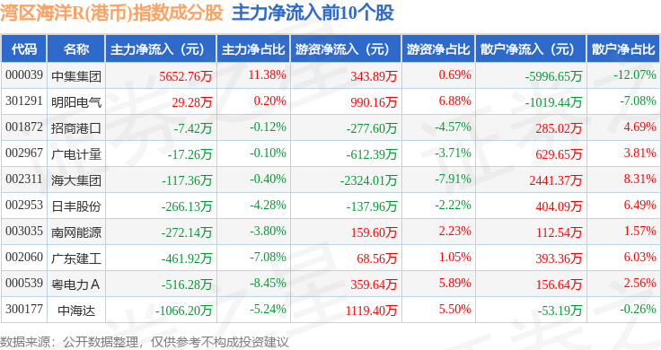 资金流向方面,湾区海洋R(港币)(480020)指数成份股当日主力资金净流出合计3664.16万元,游资资金净流入合计546.17万元,散户资金净流入合计3117.99万元。成份股资金流向详情见下表: