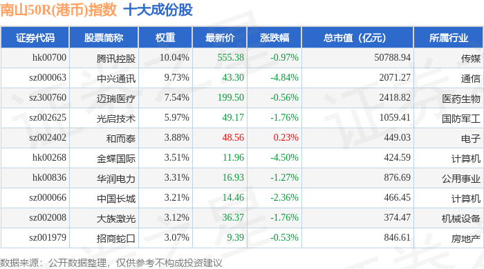 南山50R(港币)(480024)指数十大成份股详情如下:
