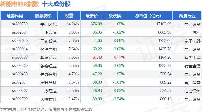 新能电池R(480032)指数十大成份股详情如下: