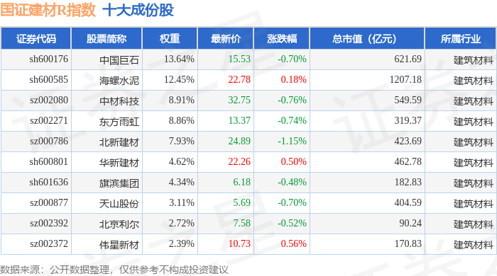 国证建材R(480048)指数十大成份股详情如下:
