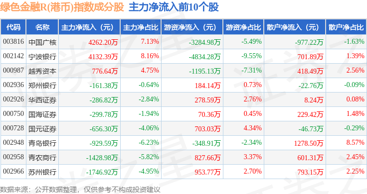 资金流向方面,绿色金融R(港币)(480053)指数成份股当日主力资金净流出合计16.88亿元,游资资金净流入合计4.66亿元,散户资金净流入合计12.22亿元。成份股资金流向详情见下表: