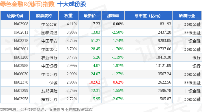 绿色金融R(港币)(480053)指数十大成份股详情如下:
