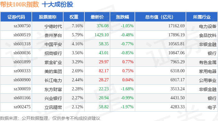 帮扶100R(480065)指数十大成份股详情如下: