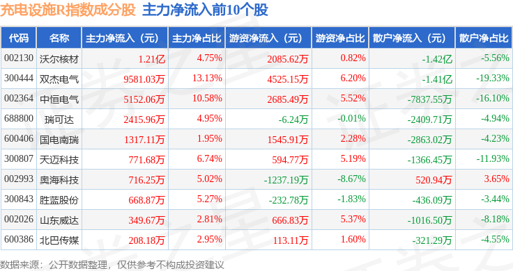 资金流向方面,充电设施R(480077)指数成份股当日主力资金净流出合计6.97亿元,游资资金净流入合计3.25亿元,散户资金净流入合计3.67亿元。成份股资金流向详情见下表: