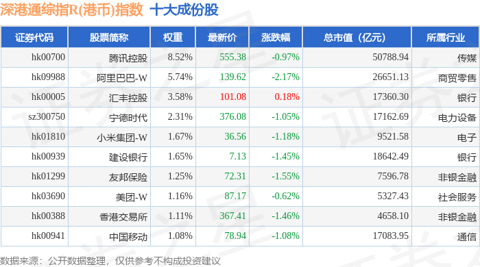深港通综指R(港币)(483006)指数十大成份股详情如下: