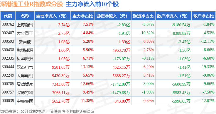 资金流向方面,深港通工业R(483017)指数成份股当日主力资金净流出合计89.38亿元,游资资金净流入合计14.3亿元,散户资金净流入合计75.07亿元。成份股资金流向详情见下表: