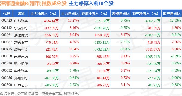 资金流向方面,深港通金融R(港币)(483026)指数成份股当日主力资金净流出合计15.66亿元,游资资金净流入合计5.1亿元,散户资金净流入合计10.56亿元。成份股资金流向详情见下表: