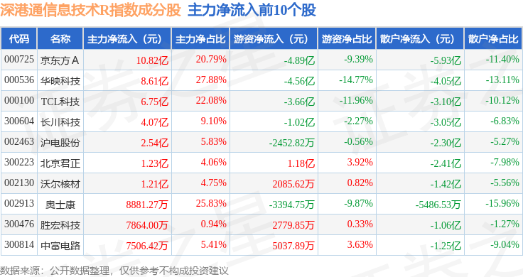 资金流向方面,深港通信息技术R(483027)指数成份股当日主力资金净流出合计119.98亿元,游资资金净流入合计6.0亿元,散户资金净流入合计113.98亿元。成份股资金流向详情见下表: