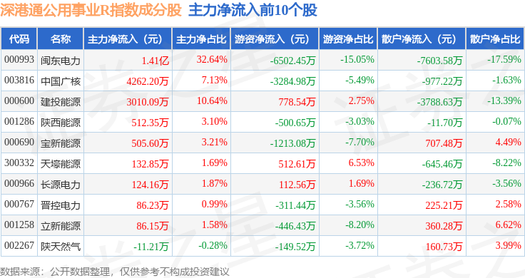 资金流向方面,深港通公用事业R(483031)指数成份股当日主力资金净流出合计1.16亿元,游资资金净流出合计8294.09万元,散户资金净流入合计1.99亿元。成份股资金流向详情见下表: