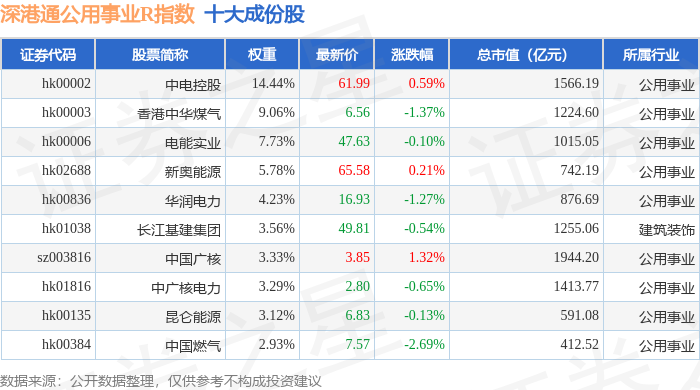 深港通公用事业R(483031)指数十大成份股详情如下:
