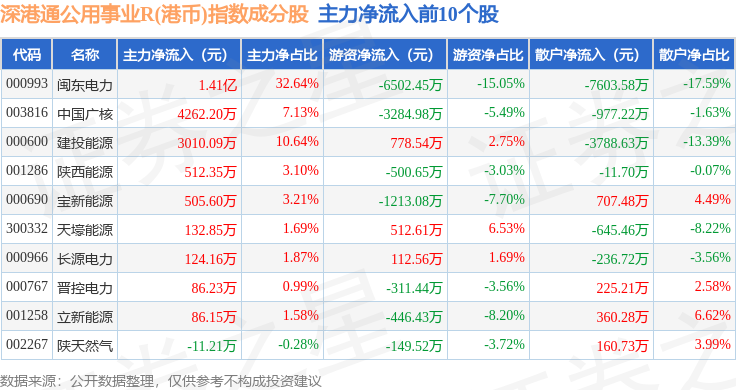 资金流向方面,深港通公用事业R(港币)(483032)指数成份股当日主力资金净流出合计1.16亿元,游资资金净流出合计8294.09万元,散户资金净流入合计1.99亿元。成份股资金流向详情见下表: