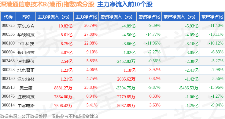 资金流向方面,深港通信息技术R(港币)(483028)指数成份股当日主力资金净流出合计119.98亿元,游资资金净流入合计6.0亿元,散户资金净流入合计113.98亿元。成份股资金流向详情见下表: