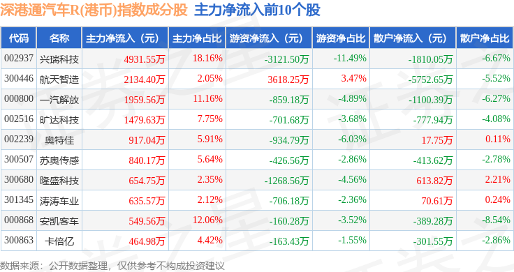 资金流向方面,深港通汽车R(港币)(483040)指数成份股当日主力资金净流出合计19.2亿元,游资资金净流入合计9820.18万元,散户资金净流入合计18.22亿元。成份股资金流向详情见下表: