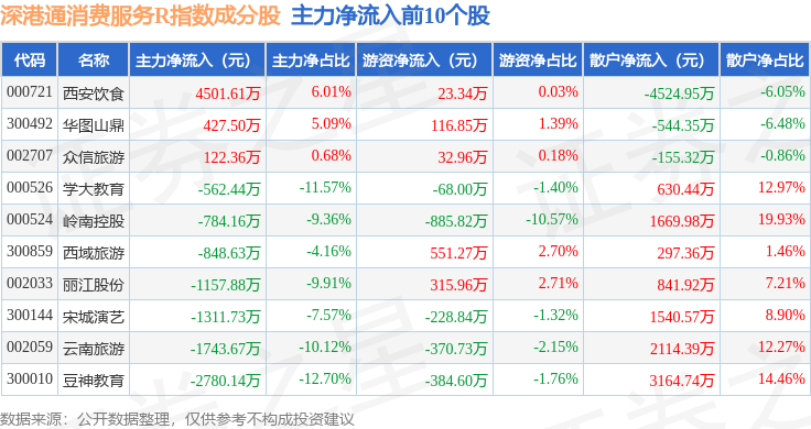 资金流向方面,深港通消费服务R(483045)指数成份股当日主力资金净流出合计3.89亿元,游资资金净流出合计1036.46万元,散户资金净流入合计3.99亿元。成份股资金流向详情见下表: