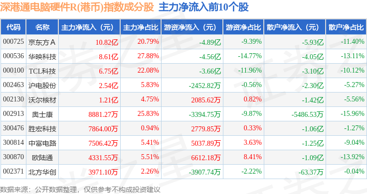 资金流向方面,深港通电脑硬件R(港币)(483044)指数成份股当日主力资金净流出合计47.0亿元,游资资金净流出合计6.17亿元,散户资金净流入合计53.17亿元。成份股资金流向详情见下表: