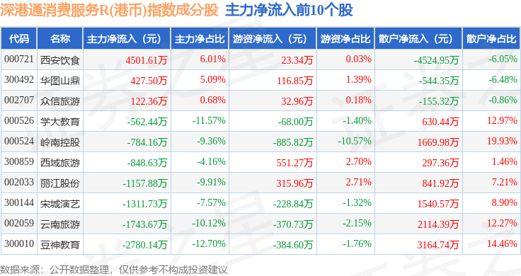 资金流向方面,深港通消费服务R(港币)(483046)指数成份股当日主力资金净流出合计3.89亿元,游资资金净流出合计1036.46万元,散户资金净流入合计3.99亿元。成份股资金流向详情见下表: