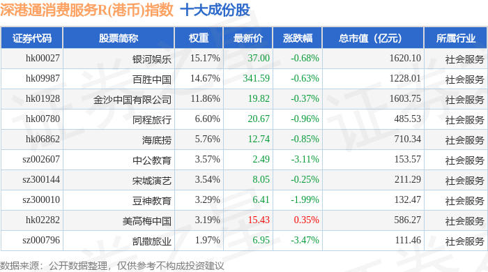深港通消费服务R(港币)(483046)指数十大成份股详情如下: