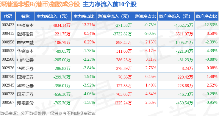 资金流向方面,深港通非银R(港币)(483054)指数成份股当日主力资金净流出合计14.42亿元,游资资金净流入合计4.62亿元,散户资金净流入合计9.8亿元。成份股资金流向详情见下表: