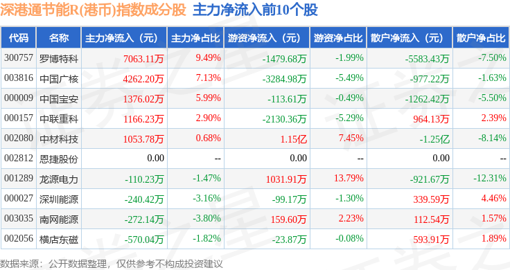 资金流向方面,深港通节能R(港币)(483086)指数成份股当日主力资金净流出合计39.7亿元,游资资金净流入合计5.32亿元,散户资金净流入合计34.38亿元。成份股资金流向详情见下表: