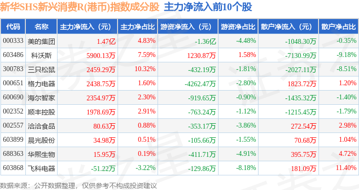 资金流向方面,新华SHS新兴消费R(港币)(489007)指数成份股当日主力资金净流出合计11.6亿元,游资资金净流入合计9497.32万元,散户资金净流入合计10.65亿元。成份股资金流向详情见下表:
