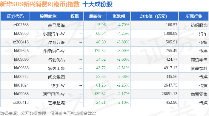 新华SHS新兴消费R(港币)(489007)指数十大成份股详情如下: