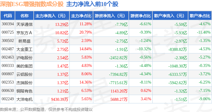 资金流向方面,深指ESG增强(970032)指数成份股当日主力资金净流出合计87.31亿元,游资资金净流入合计14.95亿元,散户资金净流入合计72.37亿元。成份股资金流向详情见下表:
