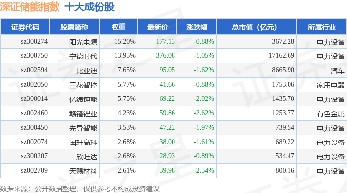 深证储能(970036)指数十大成份股详情如下: