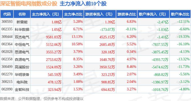 资金流向方面,深证智能电网(970054)指数成份股当日主力资金净流出合计3.33亿元,游资资金净流入合计4.56亿元,散户资金净流出合计1.22亿元。成份股资金流向详情见下表: