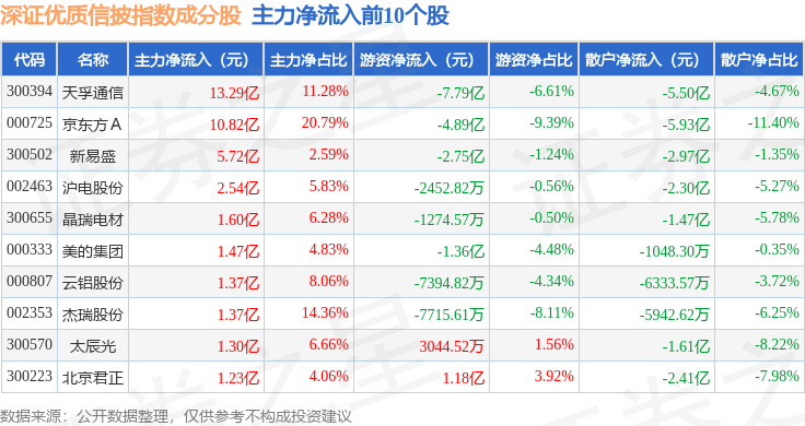 资金流向方面,深证优质信披(970065)指数成份股当日主力资金净流出合计143.67亿元,游资资金净流入合计28.06亿元,散户资金净流入合计115.61亿元。成份股资金流向详情见下表: