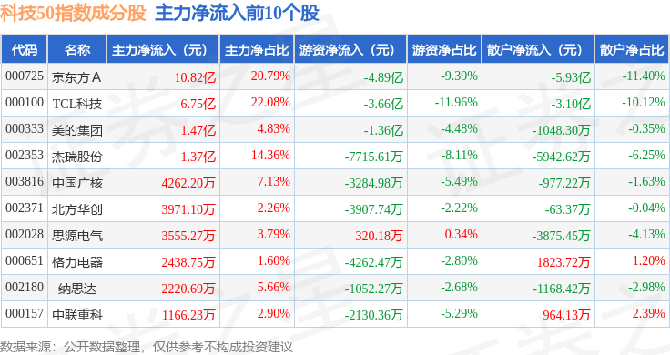 资金流向方面,科技50(970080)指数成份股当日主力资金净流出合计51.15亿元,游资资金净流入合计1.17亿元,散户资金净流入合计49.97亿元。成份股资金流向详情见下表: