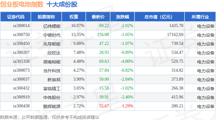 证券之星消息,12月3日,创业板电池(970081)指数报收于3386.18点,跌2.03%,成交308.66亿元,换手率3.22%。当日该指数成份股中,上涨的有2家,领湃科技以3.31%的涨幅领涨,下跌的有40家,天华新能以5.04%的跌幅领跌。