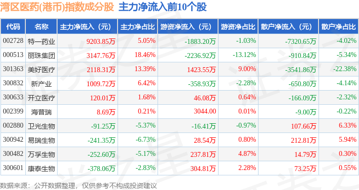 资金流向方面,湾区医药(港币)(980014)指数成份股当日主力资金净流出合计7811.6万元,游资资金净流入合计1578.33万元,散户资金净流入合计6233.27万元。成份股资金流向详情见下表: