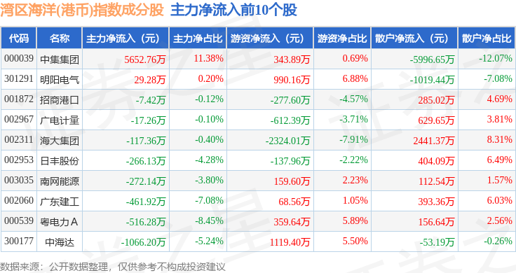 资金流向方面,湾区海洋(港币)(980020)指数成份股当日主力资金净流出合计3664.16万元,游资资金净流入合计546.17万元,散户资金净流入合计3117.99万元。成份股资金流向详情见下表: