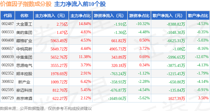 资金流向方面,价值因子(980056)指数成份股当日主力资金净流出合计7.72亿元,游资资金净流出合计1674.87万元,散户资金净流入合计7.89亿元。成份股资金流向详情见下表: