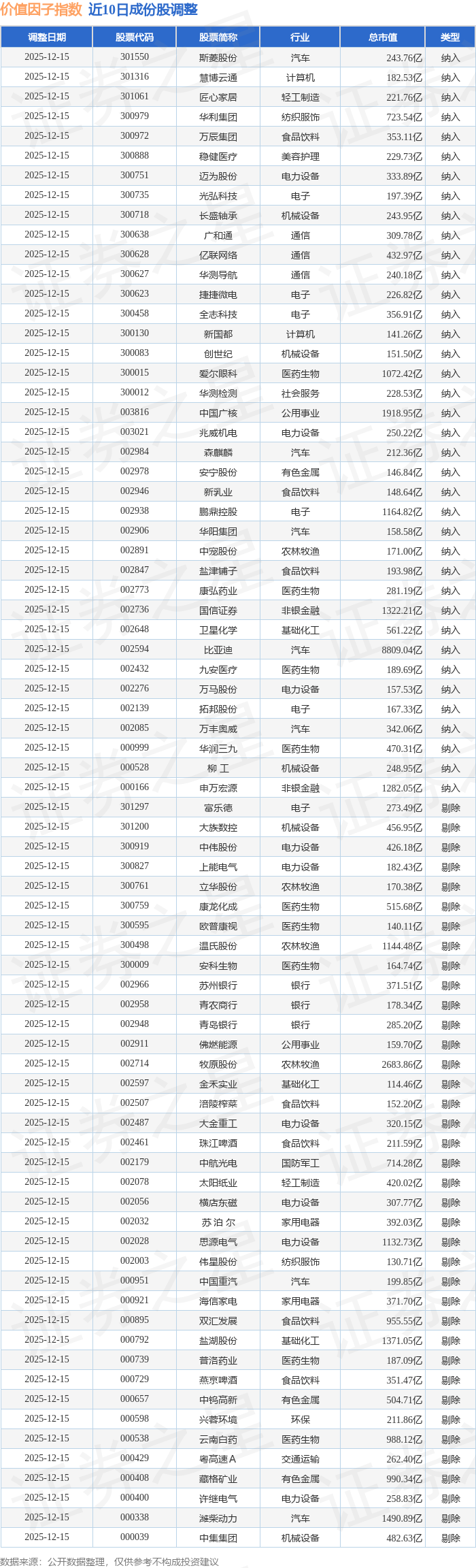 近10日内价值因子(980056)指数成份股做了调整,新纳入了38只股票,剔除了38只股票。