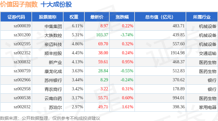 证券之星消息,12月3日,价值因子(980056)指数报收于2571.78点,涨0.1%,成交280.32亿元,换手率0.9%。当日该指数成份股中,上涨的有29家,大金重工以10.0%的涨幅领涨,下跌的有21家,大族数控以3.74%的跌幅领跌。