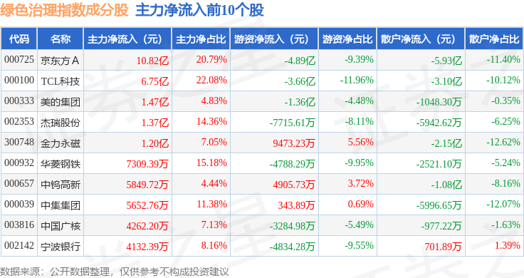 资金流向方面,绿色治理(980058)指数成份股当日主力资金净流出合计55.57亿元,游资资金净流入合计3.31亿元,散户资金净流入合计52.26亿元。成份股资金流向详情见下表: